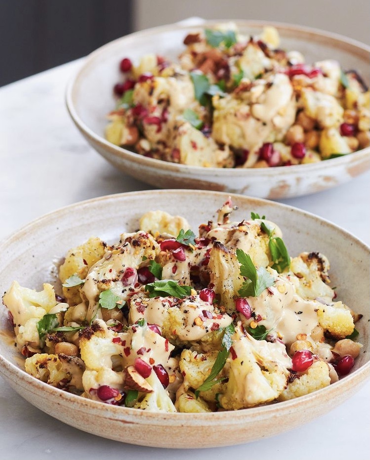 With yogurt, tahini, and maple dressing. Garnished with pomegranate seeds, roasted almonds, and fresh coriander