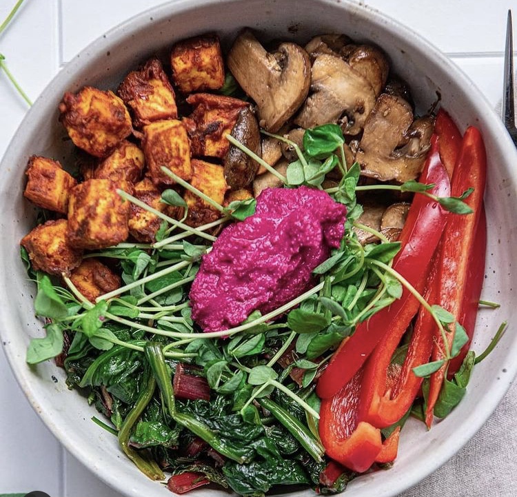 Packed with sauteed swiss chard, homemade beet hummus, mushrooms, pea shoots and red pepper.
